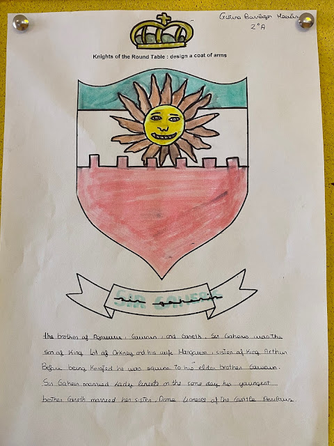 The students task was to read a description of their knight and create a coat of arms which reflected their character, using symbols, line divisions and colours. Then they wrote a short biography.